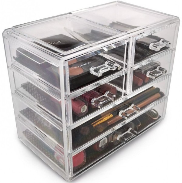 Οργανώστε όμορφα τα κοσμήματα, τα αξεσουάρ ή τα είδη μακιγιάζ σας! Τρισδιάστατος σχεδιασμός, με 4 συρτάρια για μικρότερα κοσμήματα και 2 για μεγαλύτερα είδη. Εύκολη εύρεση των πραγμάτων. Μέγεθος: 15x20x24cm.