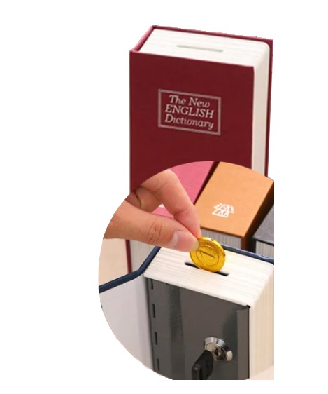 Νέο αγγλικό λεξικό –κουμπαράς με ρεαλιστική εμφάνιση και κρυφό διαμέρισμα ασφαλείας.