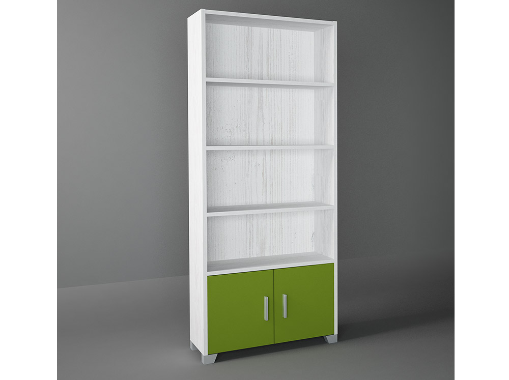 Βιβλιοθήκη σε λευκό ρουστίκ χρώμα απο μελαμίνη(πάχους 18mm) μοντέρνας σχεδίασης και υψηλής ποιότητας. Διαθέτει 4 αποθηκευτικούς χώρους και ένα ντουλάπι σε λαχανί απόχρωση, για να οργανώσετε το παιδικό δωμάτιο και να δώσετε μία διαφορετική αίσθηση στο χώρο.