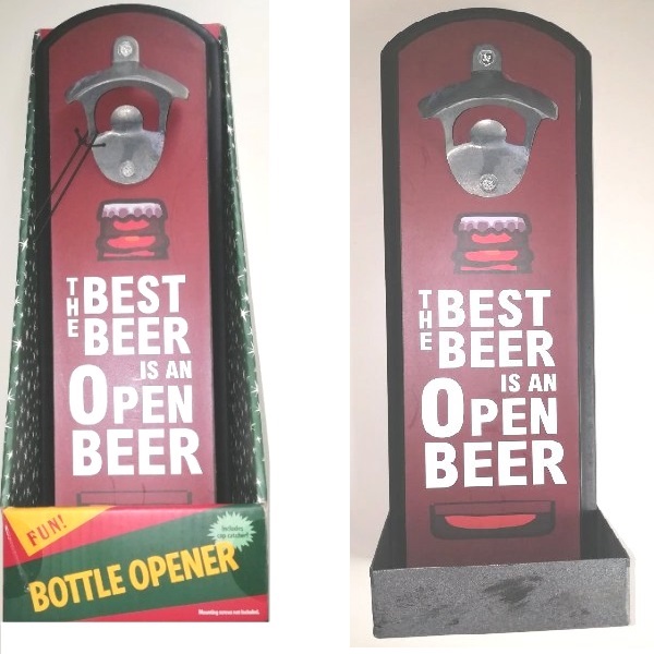 Aνοιχτήρι μπουκαλιών τοίχου σε απομίμηση ξύλου. Το κρεμάτε και ανοίγετε τα μπουκάλια σας εύκολα και άμεσα. Διαθέτει χώρο συλλογής για καπάκια στο κάτω μέρος. Ξεχωριστό αξεσουάρ που θα ομορφύνει τον χώρο σας! Διαστάσεις : 30x10x8cm.