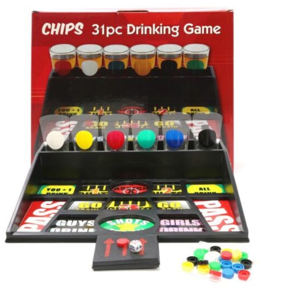 Διαθέτει πίνακα παιχνιδιών, 24 πολύχρωμες μάρκες παιχνιδιού, 1 ζάρι και 6 χρωματικά ποτήρια για σφηνάκια.