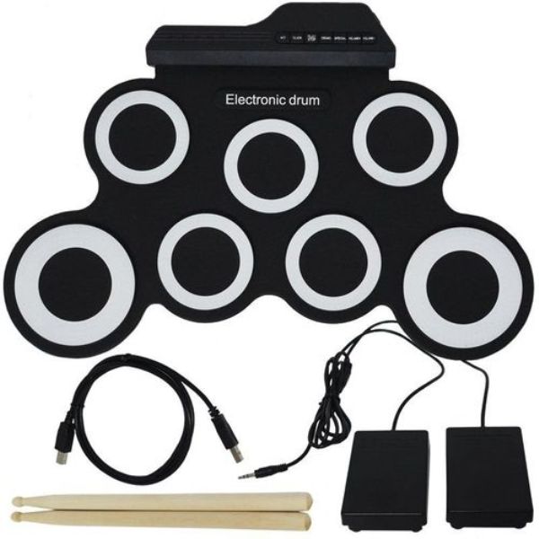 Το πακέτο περιλαμβάνει : επιφάνεια τυμπάνων από σιλικόνη, 2 ξύλινες μπαγκέτες, 2 πεντάλ για μπάσο και λειτουργία HI-HAT, καλώδιο USB, καλώδιο AUX, οδηγίες χρήσης.