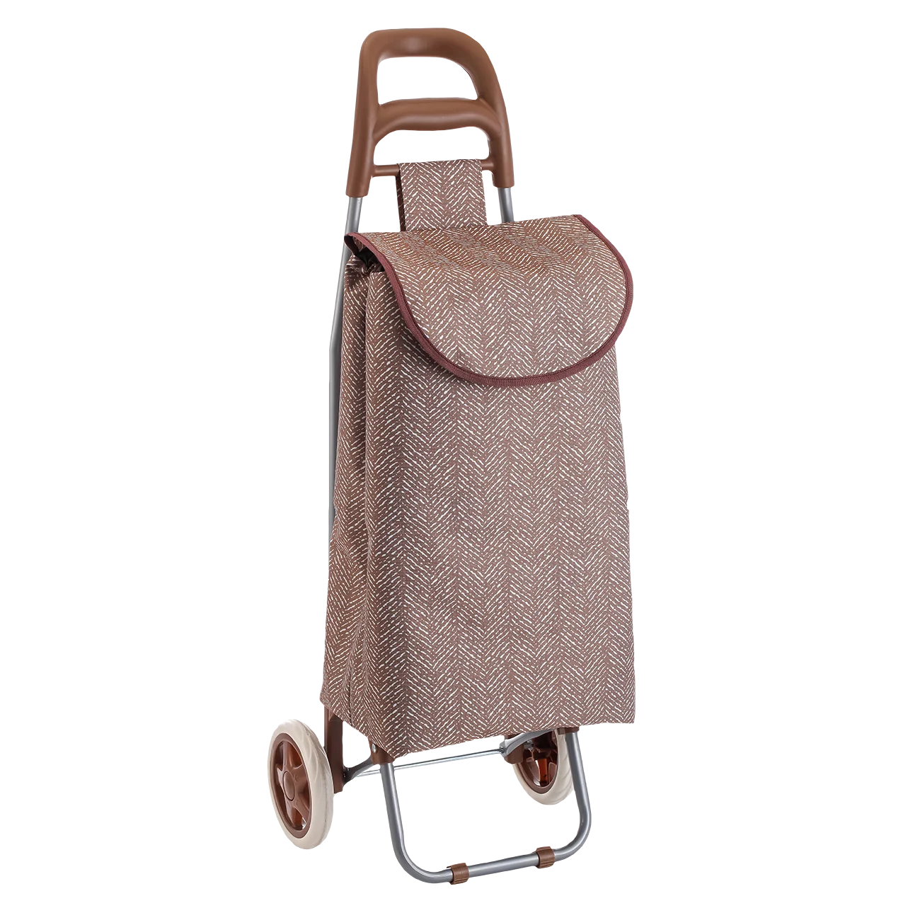 Καρότσι τρόλεϋ μεγάλης αντοχής με αδιάβροχο κάλυμμα πλενόμενο σε καφέ χρώμα. Διαθέτει εργονομική λαβή και έξυπνη θήκη για να βάλετε το πορτοφόλι σας ή τα κλειδιά σας. Μία πρακτική επιλογή για τις αγορές σας.