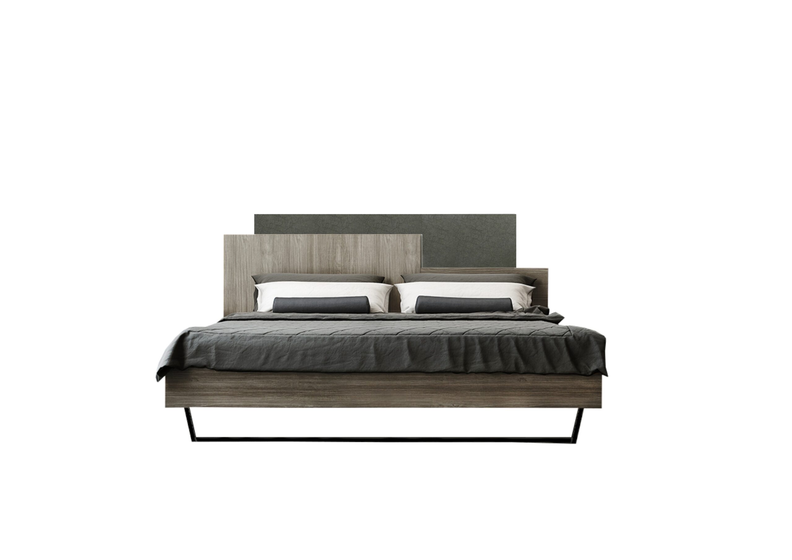 Κρεβάτι διπλό κατασκευασμένο από ενισχυμένο σκελετό μελαμίνης υψηλής ποιότητας σε χρώμα σταχτί, με μεταλλικό πόδι και ελληνικής προελεύσεως. Μία μοντέρνα επιλογή κατάλληλη για οικιακή αλλά και επαγγελματική χρήση (π.χ ξενοδοχεία).