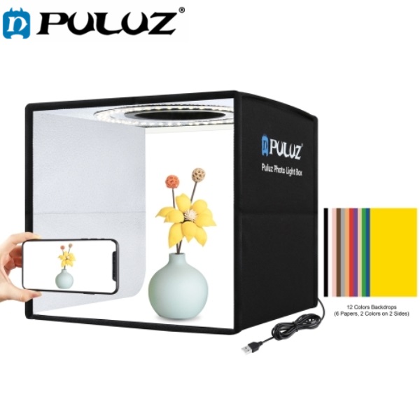 Με ειδικό άνοιγμα στο πάνω μέρος για φωτογράφηση αντικειμένου απο πάνω!ΧαρακτηριστικάΜοντέλο: PU5025ΒΔιαστάσεις: 25cm x 25cm Διαθέτει 6 backrounds με 12 διαφορετικά χρώματα για να ταιριάζει στις ανάγκες σας.Αριθμός LED: 96 led (Ring) στην πάνω πλευράΦωτεινότητα: 24-26lmΘερμοκρασία χρώματος: 5500Κ Ρύθμιση Φωτεινότητας: 1%-100%Μήκος καλωδίου: 2mTάση λειτουργίας / Ισχύς: 5V / 1-10W – Προτείνεται φορτιστής USB 5V-2A