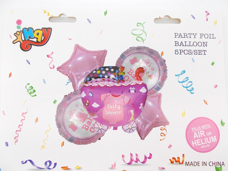 Το πακέτο περιλαμβάνει 5 μπαλόνια: 1x καροτσάκι , 2x σχήμα αστεριού ροζ , 2x στρογγυλά χρωματιστά.