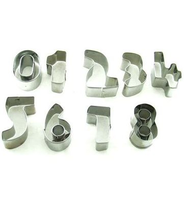 Ανοξείδωτα κουπάτ σε σχήμα αριθμών. Το σετ περιλαμβάνει τους αριθμούς από 0 – 8. Τα χρησιμοποιείτε για να φτιάξετε μπισκότα ή διακοσμητικά για τα γλυκά σας. Σημείωση : το 6 γίνεται και 9 επίσης. Ύψος ψηφίου : περίπου 4cm.
