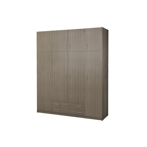 Ντουλάπα τετράφυλλη κατασκευασμένη από ενισχυμένο σκελετό μελαμίνης άριστης ποιότητας σε σταχτί χρώμα. Διαθέτει πατάρι, 2 μεγάλα συρτάρια με μεταλλικό μηχανισμό καθώς και ράφι στο αριστερό και δεξί φύλλο. Μία πρακτική επιλογή με μεγάλη χωρητικότητα για να δημιουργήσετε ένα λειτουργικό χώρο.