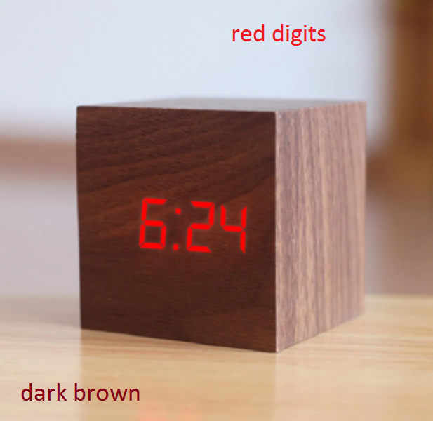 Ξύλινο επιτραπέζιο ρολόι κύβος καφέ σκούρο με κόκκινα ψηφία, απομίμηση ξύλου OEM