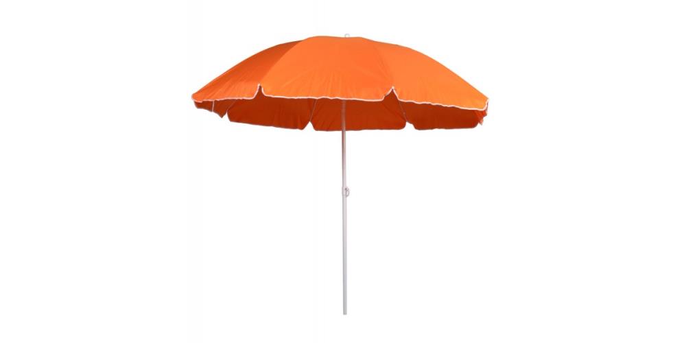 Ομπρέλα θαλάσσης στρόγγυλη από ενισχυμένο μεταλλικό σκελετό σε λευκό χρώμα και ανθεκτικό αδιάβροχο polyester(180gr) ύφασμα σε πορτοκαλί χρώμα. Διαθέτει κολώνα στήριξης 25/22mm, 8 ακτίνες fiberglass πάχους 5mm, μηχανισμό ανάκλισης και ελαστικές ακτίνες στήριξης. Κατάλληλη για τις καλοκαιρινές σας εξορμήσεις.