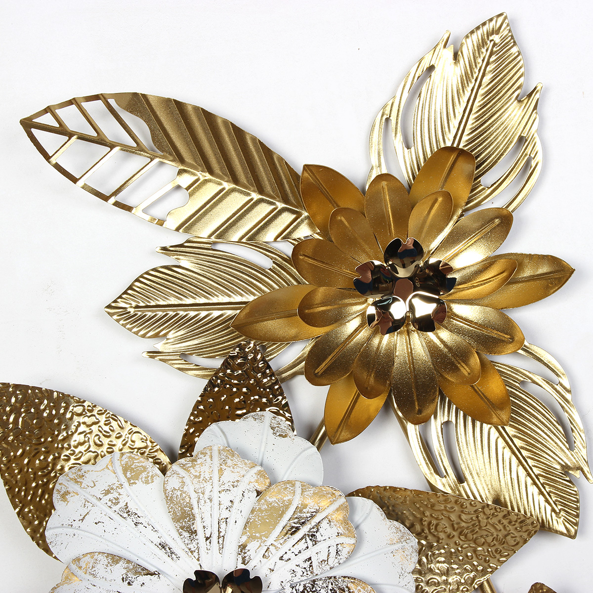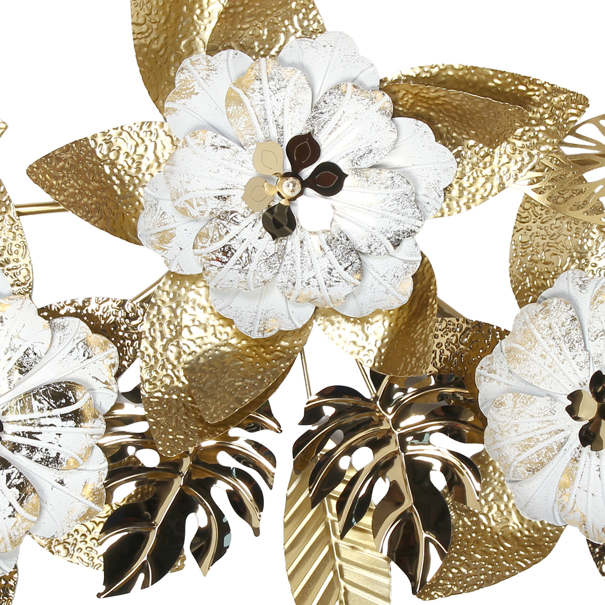 Αυτός ο πίνακας τοίχου μεταλλικός 131Χ63 εκ. σε λευκό-χρυσό φινίρισμα συνδυάζει μοντέρνο design με κλασική κομψότητα. Τα ανάγλυφα λουλούδια και φύλλα δίνουν μια τρισδιάστατη αίσθηση, δημιουργώντας ένα εκλεπτυσμένο διακοσμητικό στοιχείο για κάθε χώρο.