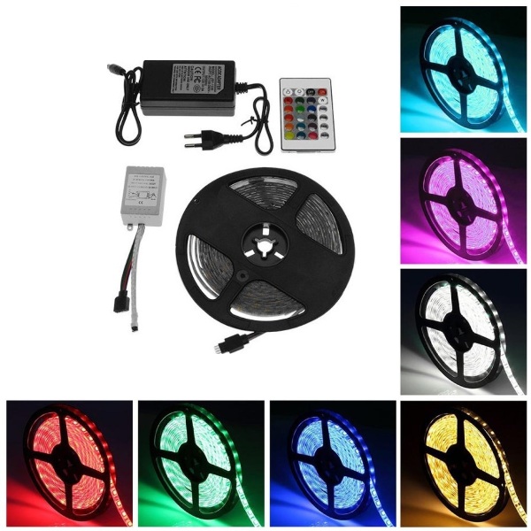 Πλήρες σετ 5 μέτρων LED RGB αυτοκόλλητης ταινίας 60SMD 4,8W/m με τροφοδοτικό, controller και τηλεκοντρόλ.