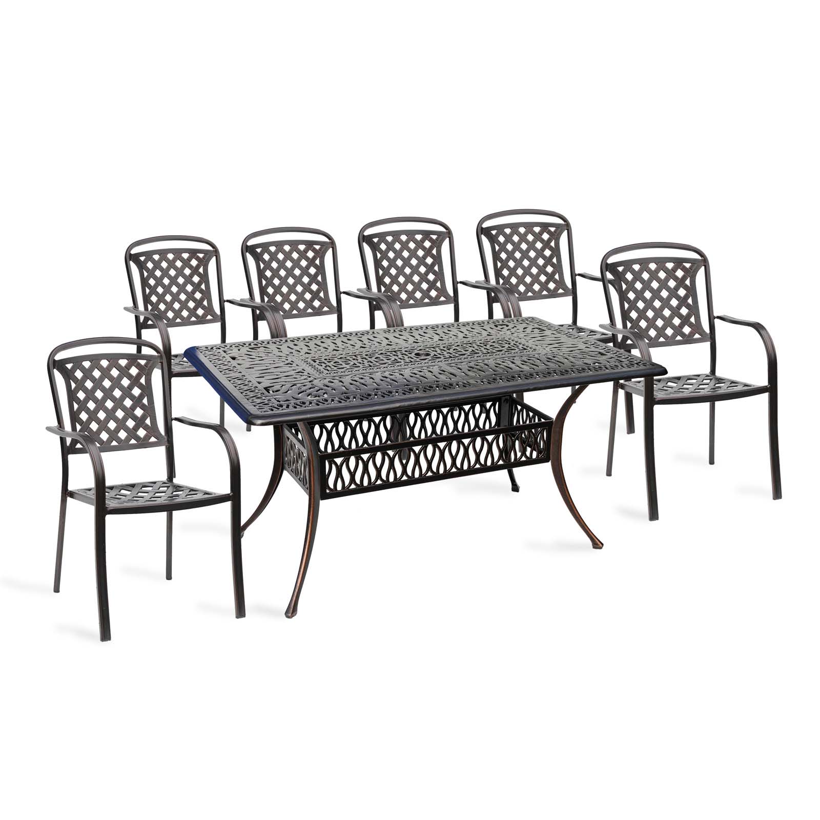 Σετ εξωτερικού χώρου από ενισχυμένο σκελετό αλουμινίου υψηλής ποιότητας και ανθεκτικότητας στον χρόνο σε χρώμα αντικέ χάλκινο. Το σετ αποτελείται από ένα τραπέζι και έξι πολυθρόνες. Ιδανική επιλογή για προσωπικό ή επαγγελματικό χώρο καθώς μπορεί εύκολα να εναρμονιστεί με την υπάρχουσα διακόσμηση και να δώσει μία ευχάριστη νότα στον χώρο που θα τοποθετηθεί. Ιδανική επιλογή για προσωπικό ή επαγγελματικό χώρο.