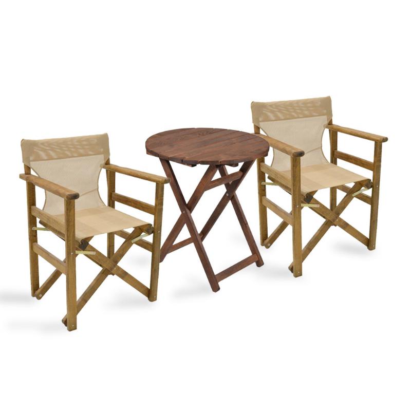 Σετ κήπου τριών τεμαχίων το όποιο αποτελείται από ένα τραπέζι και δύο πολυθρόνες σκηνοθέτη. Τραπέζι στρόγγυλο κατασκευασμένο από ενισχυμένο ξύλινο σκελετό σε καρυδί χρώμα και δύο πολυθρόνες σκηνοθέτη από ξύλο φουρνιστής οξιάς και ύφασμα textilene υψηλής ποιότητας και ανθεκτικότητας στον χρόνο σε χρώμα καρυδί με καπουτσινο. Μία μοντέρνα επιλογή, η οποία θα σας χαρίσει στιγμές χαλάρωσης και αναπαυτικότητας και θα ομορφύνει τον εξωτερικό χώρο που θα τοποθετηθεί.