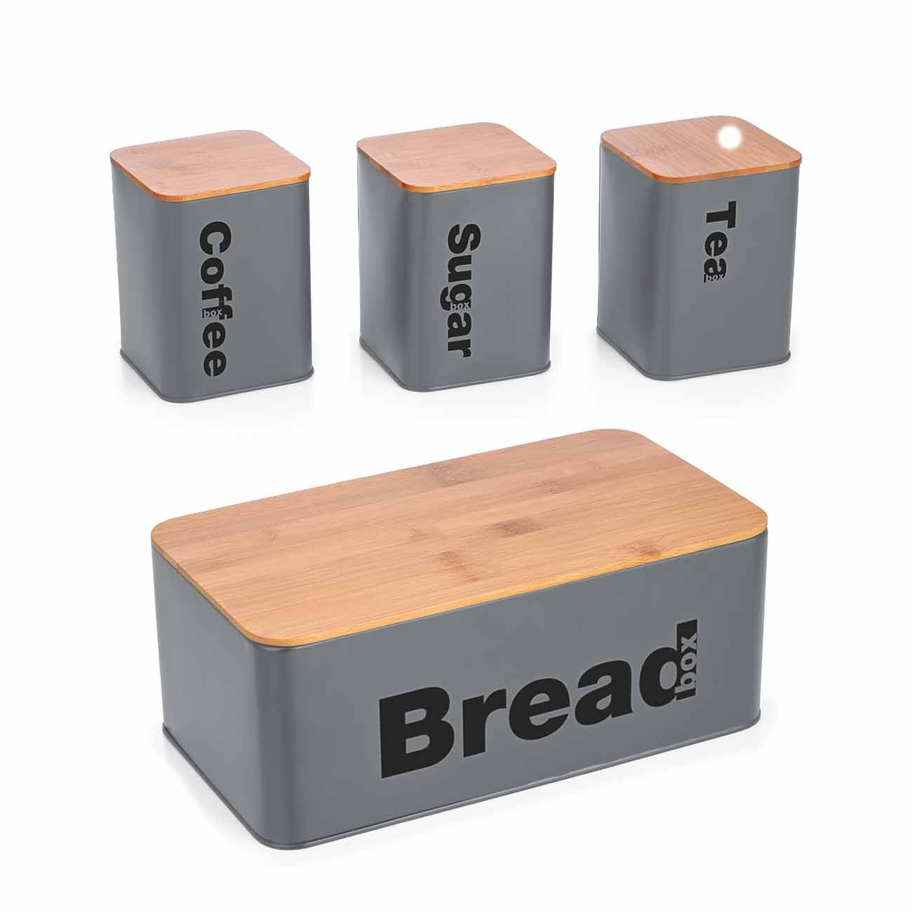 Σετ κουζίνας τεσσάρων τεμαχίων κατασκευασμένο από μέταλλο σε γκρι χρώμα. Το σετ αποτελείται από μία ψωμιέρα και τρία βάζα αποθήκευσης κατάλληλα για καφέ, ζάχαρη και τσάι. Το κάθε δοχείο διαθέτει μπαμπού καπάκι ώστε να προστατεύεται το εσωτερικό του.Μια μοντέρνα και πρακτική επιλογή καθώς το απλό και λιτό design θα εναρμονιστεί τέλεια σε κάθε στυλ διακόσμησης κουζίνας.