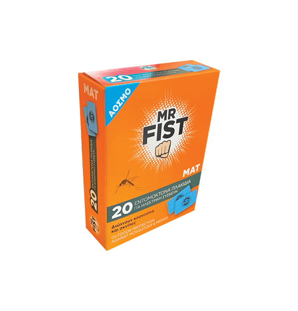 Τα εντομοαπωθητικά πλακίδια Mr.Fist Mat απομακρύνουν άμεσα κουνούπια και σκνίπες από εσωτερικούς και εξωτερικούς χώρους. Κάθε ένα πλακίδιο τοποθετείται σε ειδική ηλεκτρική συσκευή. Εκεί θερμαίνεται και απελευθερώνει στο χώρο συστατικά που απωθούν και ναρκώνουν τα έντομα (ώστε να μην τσιμπούν). Η δράση κάθε πλακιδίου διαρκεί όλη τη νύχτα (περίπου 8 ώρες). Το προϊόν διατίθεται σε συσκευασίες των 10, 20 και 30 πλακιδίων ανά τεμάχιο