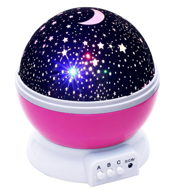 Αυτό το νυχτερινό φως προσφέρει 3 λειτουργίες: A = σταθερό θερμό λευκό φως, B = πολλαπλά χρώματα που προβάλλονται το ένα πάνω στο άλλο, C = περιστρεφόμενο φεγγάρι και αστέρια!