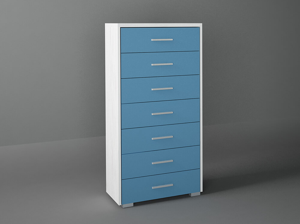 Συρταριέρα κατασκευασμένη από μελαμίνη υψηλής ποιότητας και ανθεκτικότητας, σε χρώμα λευκό ρουστίκ-σιέλ. Φέρει 7 αποθηκευτικούς χώρους με μηχανισμό για εύκολη χρήση. Διαθέτει αντιχαρακτική επιφάνεια για αντοχή στις γρατζουνίες. Μία μοντέρνα επιλογή για να κοσμήσετε και να οργανώσετε το χώρο σας. Κατάλληλη και για προσωπική αλλά και επαγγελματική χρήση (π.χ ξενοδοχείο).
