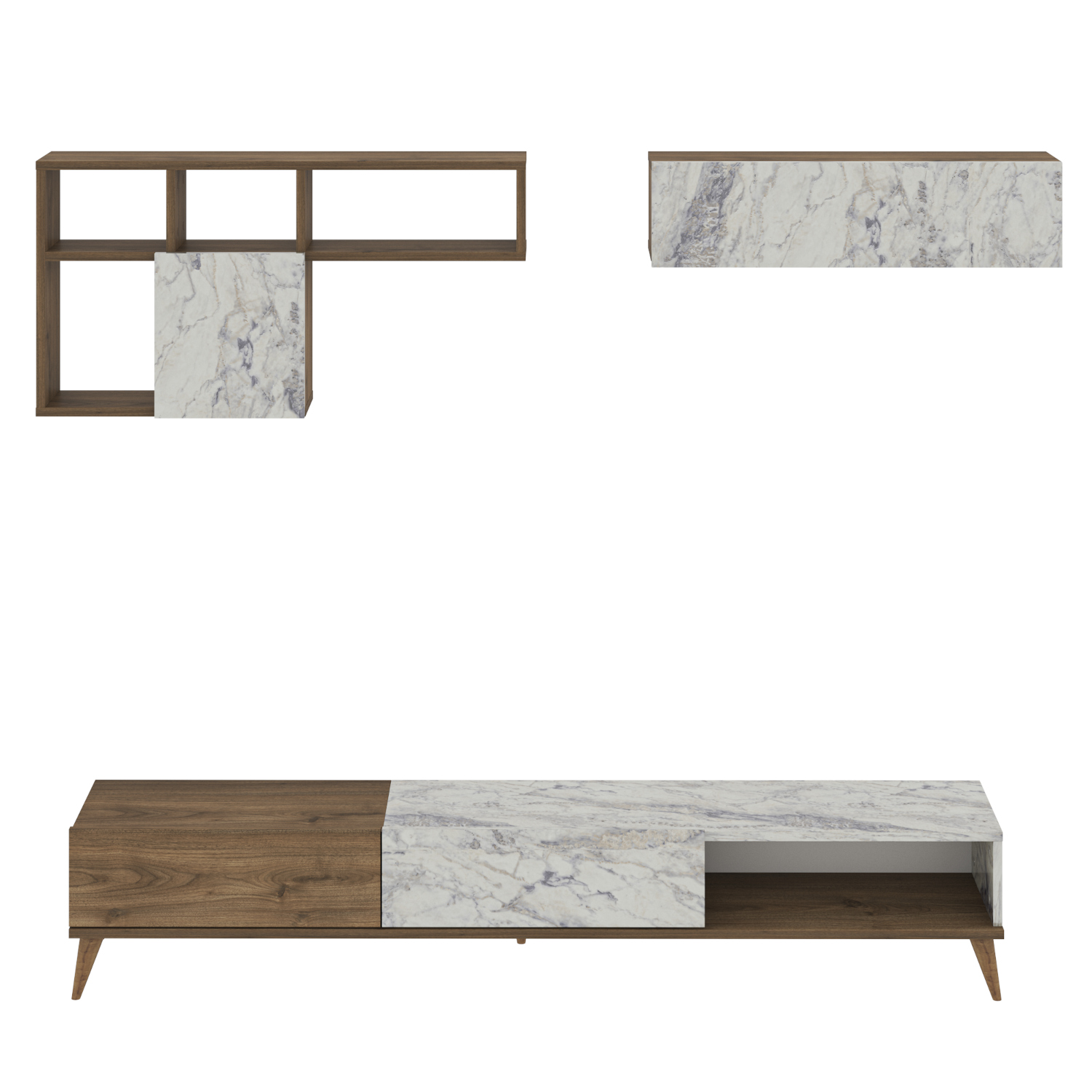 - Δύο επιτοίχια ράφια ολοκληρώνουν το σύνολο και παρέχουν επιπλέον χώρους αποθήκευσης για διακοσμητικά και άλλα αντικείμενα