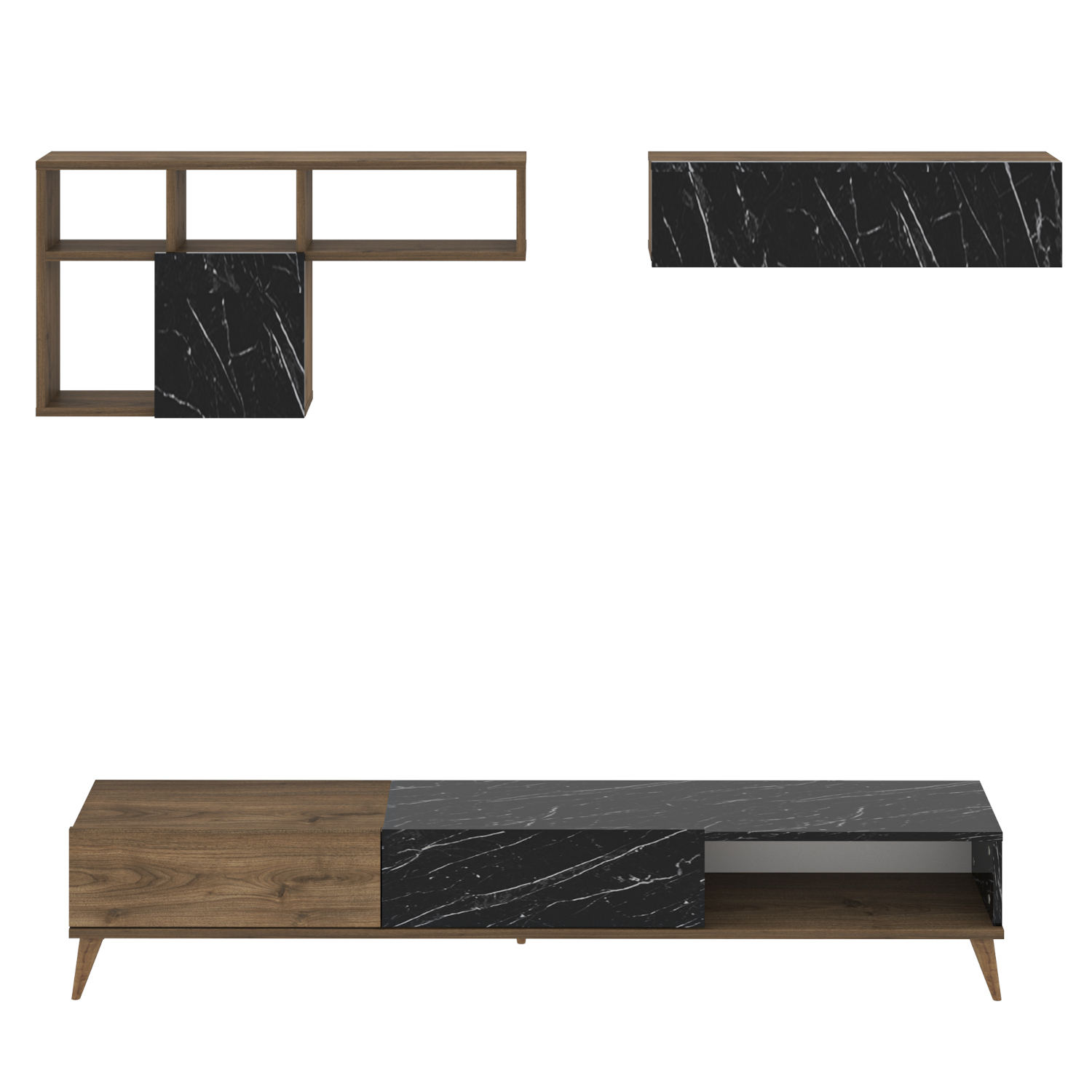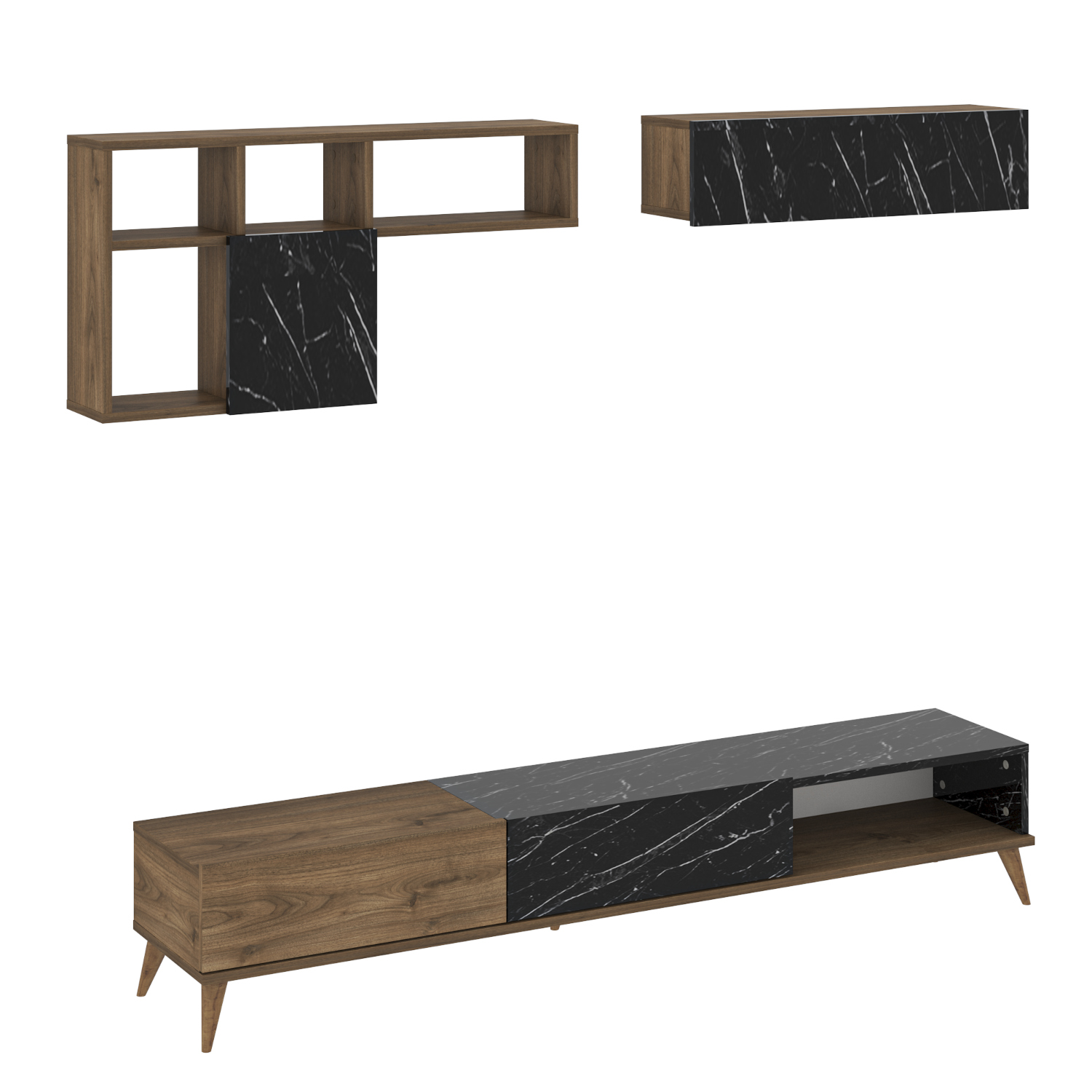 - Δύο επιτοίχια ράφια ολοκληρώνουν το σύνολο και παρέχουν επιπλέον χώρους αποθήκευσης για διακοσμητικά και άλλα αντικείμενα