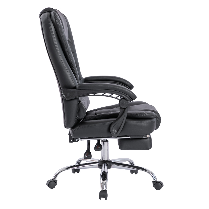 A4550 πολυθρόνα διευθυντική ξεκούραστη με άνετο κάθισμα σε μαύρο PU.Τα μπράτσα του είναι πολυπροπυλενίου,φαρδιά με μαξιλαράκι για άνετο στήριγμα των χεριών.Διαθέτει επεκτεινόμενο υποπόδιο για μεγαλύτερη άνεση.