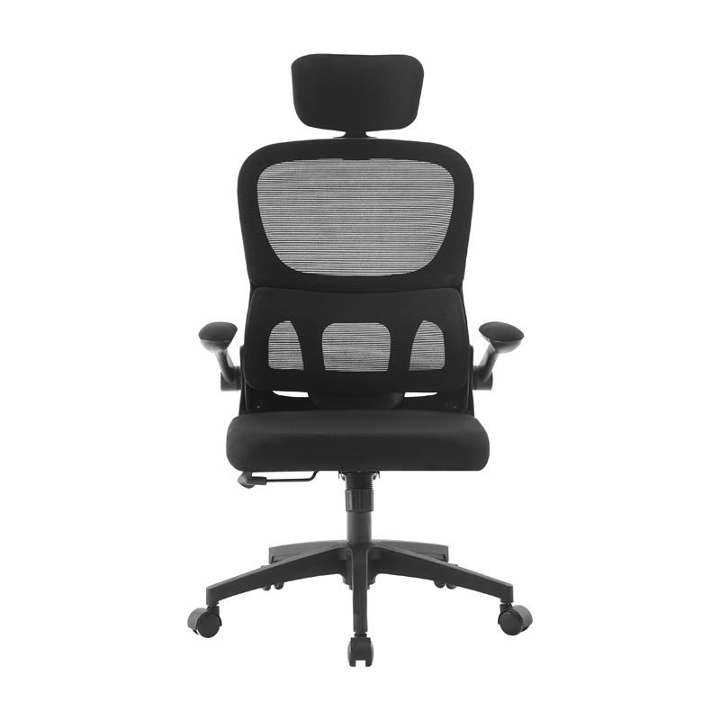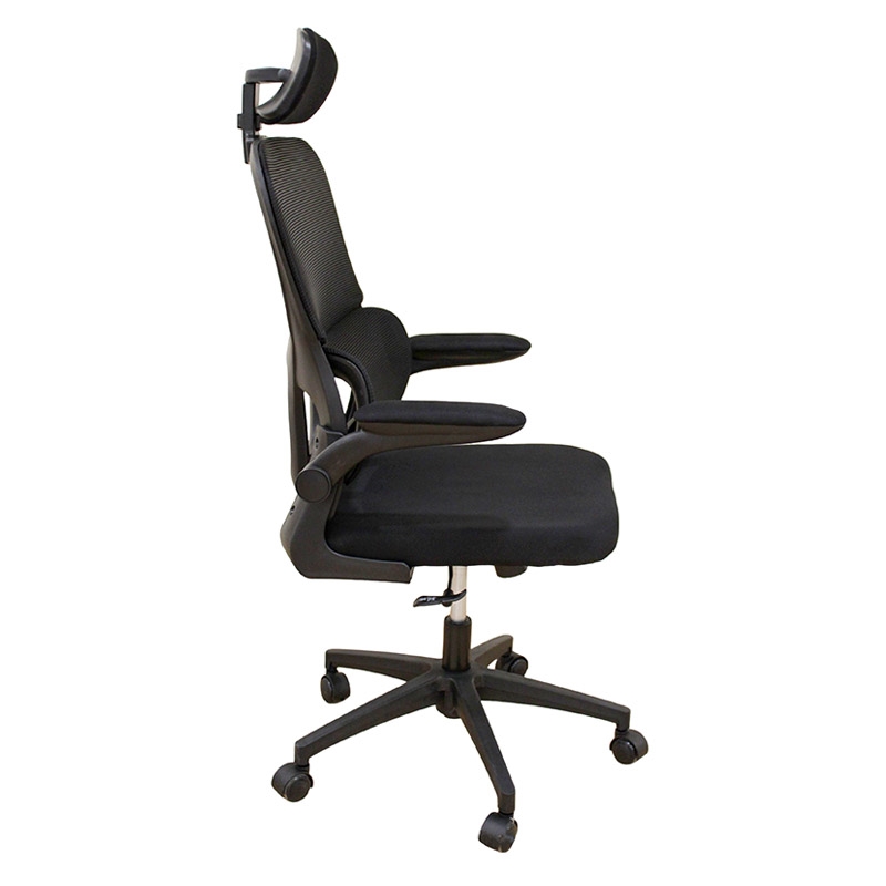 A9935 πολυθρόνα γραφείου με mesh ύφασμα στο κάθισμα μαύρου χρώματος καθώς επίσης και ανατομική πλάτη σε mesh ύφασμα χρώματος μαύρο για να αναπνέει η πλάτη.Διαθέτει προσκέφαλο για σωστή στήριξη του κεφαλιού και σύστημα υποστήριξης μέσης.Πτυσσόμενα μπράτσα ενδεδυμένα με μαύρο mesh διάτρητο ύφασμα,ρυθμιζόμενο ύψος,πλαστικό πόδι και ρόδες για εύκολη μετακίνηση.