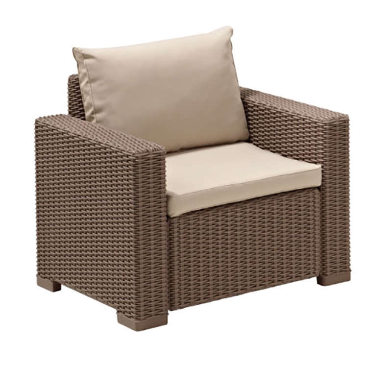 Πολυθρόνα CALIFORNIA του οίκου Allibert K/D σε χρώμα cappuccino με μαξιλάρι από resin.Με ιδιάιτερη πλέξη που θα ομορφύνει τον κήπο ή την βεράντα σας.Συνδιάστε την με καναπέ και τραπεζάκι του ίδιου οίκου για ένα ολοκληρωμένο σετ.