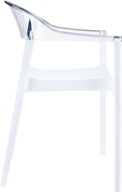 Πολυθρόνα CARMEN του οίκου Siesta σε χρώμα white/clear σε μοντέρνο design, με ιδιαίτερες αποχρώσεις. Κατασκευασμένη η πλάτη της από διάφανο πολυκαρμπονικό της Makrolon και σκελετό από πολυπροπυλένιο ενισχυμένο με fiber glass για απόλυτη αντοχή. Κατάλληλη για εσωτερική και εξωτερική χρήση, στοιβαζόμενη, σε πολλά χρώματα. Ιδανική επιλογή για επαγγελματικούς χώρους. Πιστοποιημένο προϊόν από τον Ιταλικό οίκο CATAS.