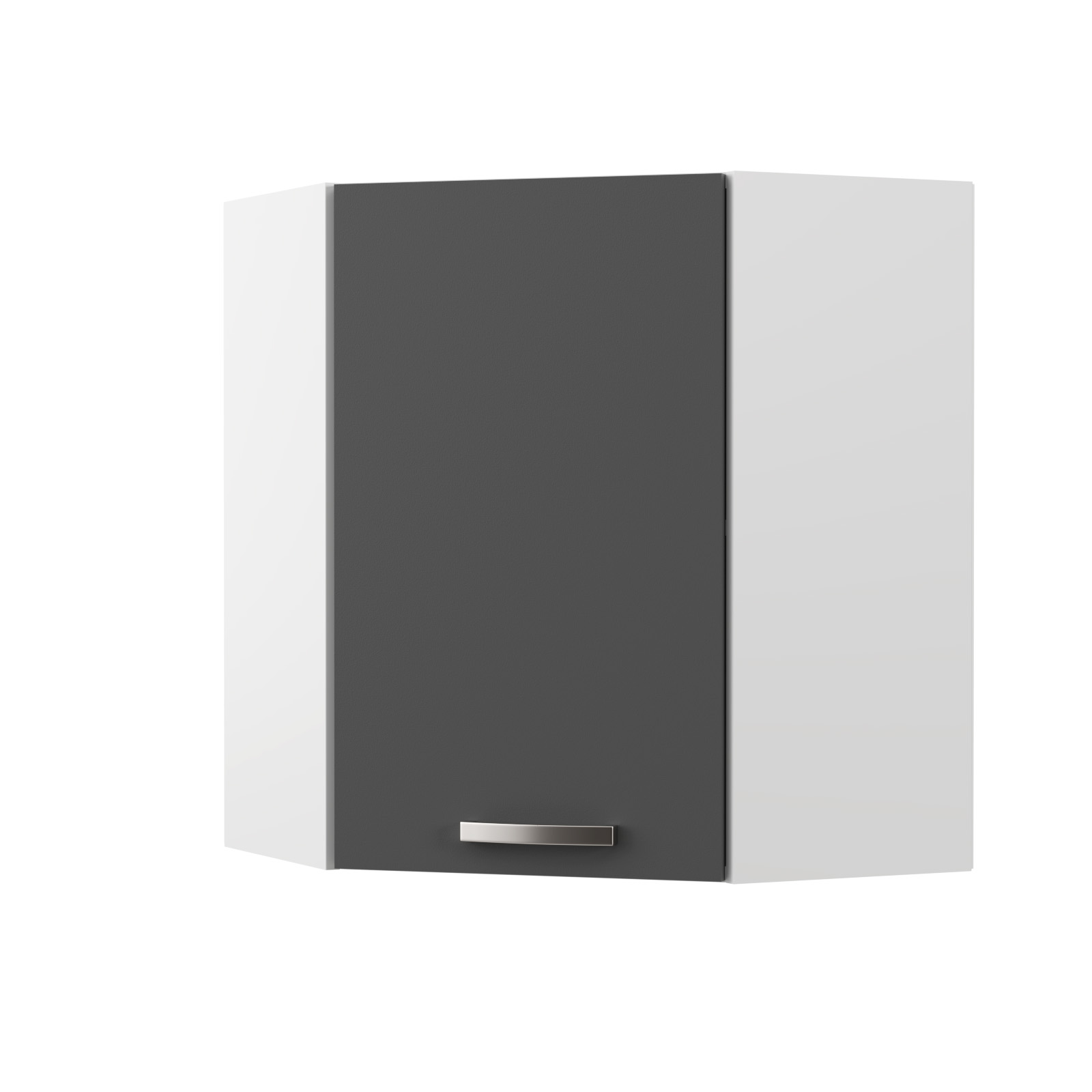 Πάνω Ντουλάπι Κουζίνας Γωνιακό 60x60x71.8, εξαιρετικής ποιότητας και υψηλής αντοχής σε απόχρωση Γραφίτη. Το έπιπλο διαθέτει ένα ντουλάπι και ένα εσωτερικό ράφι. Διακοσμήστε και οργανώστε την κουζίνα σας με μοντέρνο και πρακτικό τρόπο, χαρίζοντας κομψότητα και φινέτσα.