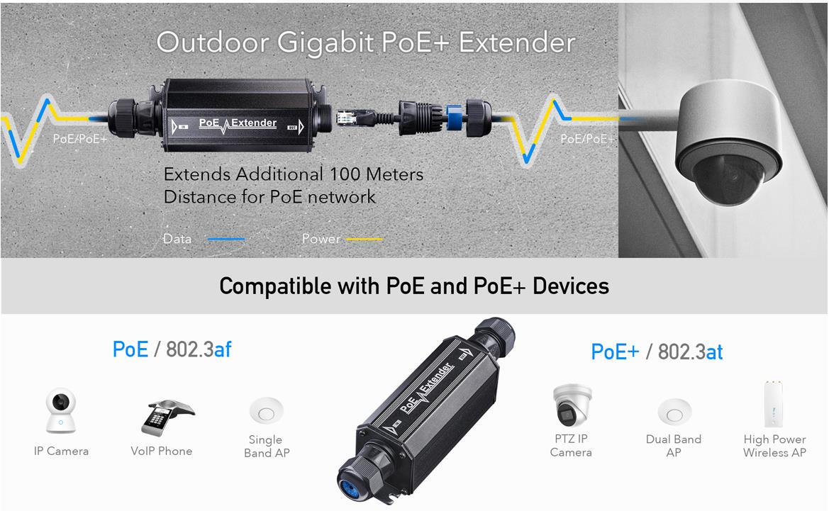 ● Extends the range of PoE and Ethernet an additional 100 meters