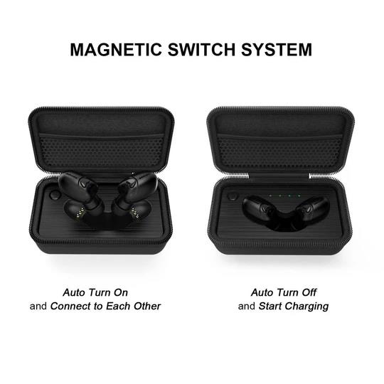 Featuring the latest AUTO ON/OFF technology. When you take out the earbuds from charging case, they will be turned on automatically, and when you put them back in the case, they will be turned off and get charged without touching any button.