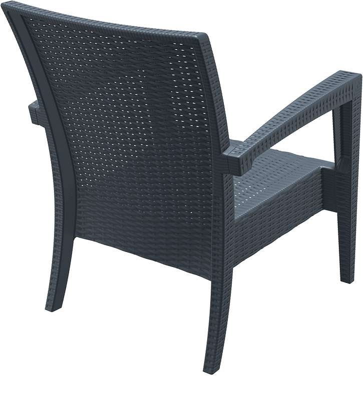 Miami πολυθρόνα του οίκου Siesta σε χρώμα dark grey,από υψηλής ποιότητας πολυπροπυλένιο με ενίσχυση από υαλώδεις ίνες (fiber glass) για απόλυτη αντοχή. Χωρίς μεταλλικό σκελετό για μεγαλύτερη αξιοπιστία στον χρόνο. Είναι στοιβαζόμενη και διαθέτει UV protection για μέγιστη προστασία από τον ήλιο ώστε να μην αλλοιωθούν τα χρώματα. Κατάλληλη για εσωτερική και εξωτερική χρήση. Διατίθεται και μαξιλάρι.Πιστοποιημένο προιόν από τον Ιταλικό οίκο CATAS.