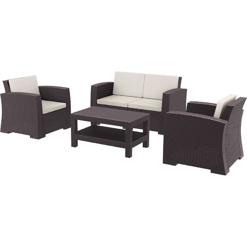 Monaco set K/D του οίκου Siesta σε χρώμα brown. Το SET περιλαμβάνει 1 2θέσιο καναπέ, 2 πολυθρόνες, τραπέζι και μαξιλάρια. Από υψηλής ποιότητας πολυπροπυλένιο με ενίσχυση από υαλώδεις ίνες (fiber glass) για απόλυτη αντοχή. Χωρίς μεταλλικό σκελετό για μεγαλύτερη αξιοπιστία στον χρόνο. Διαθέτει UV protection για μέγιστη προστασία από τον ήλιο ώστε να μην αλλοιωθούν τα χρώματα. Κατάλληλο για εσωτερική και εξωτερική χρήση. Πιστοποιημένο προϊόν από τον Ιταλικό οίκο CATAS.