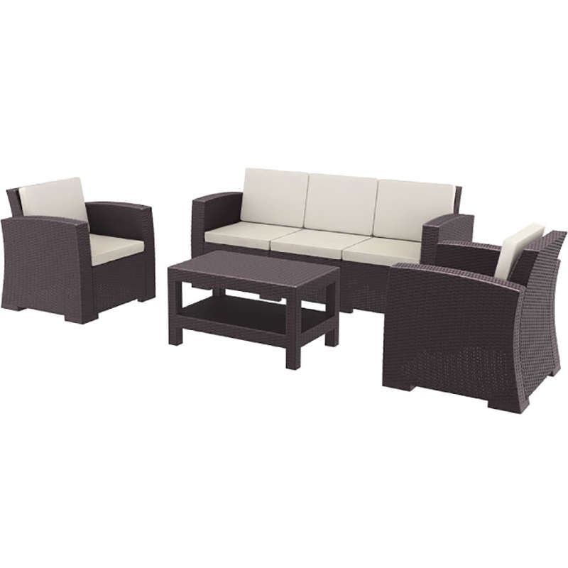 Monaco set K/D του οίκου Siesta σε χρώμα brown.Το SET περιλαμβάνει 1 3θέσιο καναπέ, 2 πολυθρόνες, τραπέζι και μαξιλάρια. Από υψηλής ποιότητας πολυπροπυλένιο με ενίσχυση από υαλώδεις ίνες (fiber glass) για απόλυτη αντοχή. Χωρίς μεταλλικό σκελετό για μεγαλύτερη αξιοπιστία στον χρόνο. Διαθέτει UV protection για μέγιστη προστασία από τον ήλιο ώστε να μην αλλοιωθούν τα χρώματα. Κατάλληλο για εσωτερική και εξωτερική χρήση. Πιστοποιημένο προϊόν από τον Ιταλικό οίκο CATAS.