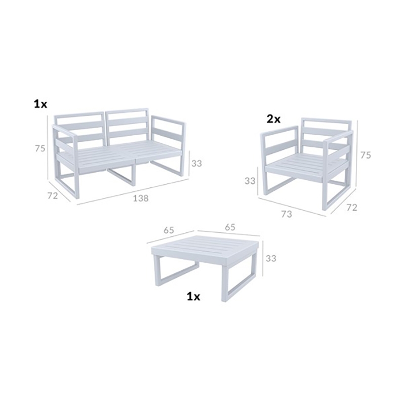 Mykonos set του οίκου Siesta σε χρώμα white.Το set περιλαμβάνει 1 2θέσιο καναπέ,2 πολυθρόνες,τραπέζι και μαξιλάρια.Από υψηλής ποιότητας πολυπροπυλένιο με ενίσχυση από υαλώδεις ίνες (fiber glass) για απόλυτη αντοχή.Χωρίς μεταλλικό σκελετό για μεγαλύτερη αξιοπιστία στον χρόνο.Διαθέτει UV protection για μέγιστη προστασία από τον ήλιο ώστε να μην αλλοιωθούν τα χρώματα.Κατάλληλο για εσωτερική και εξωτερική χρήση.Πιστοποιημένο προϊόν από τον Ιταλικό οίκο CATAS.