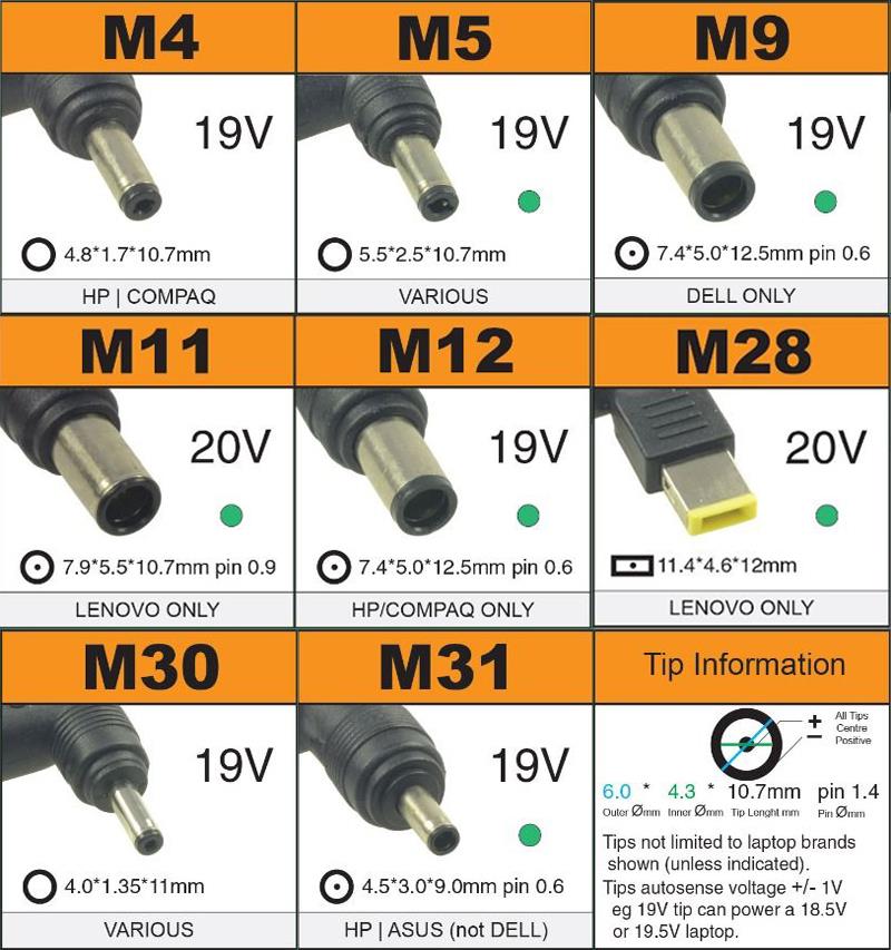 SeriesM28 20V 11*4.6*12mm LENOVO UltrabookM30 19V 4.0*1.35*11mm ASUSM31 19.5V 4.5*3.0*12mm pin0.6 HP Envy